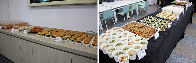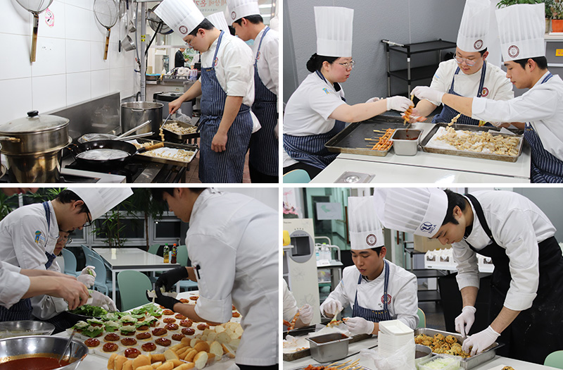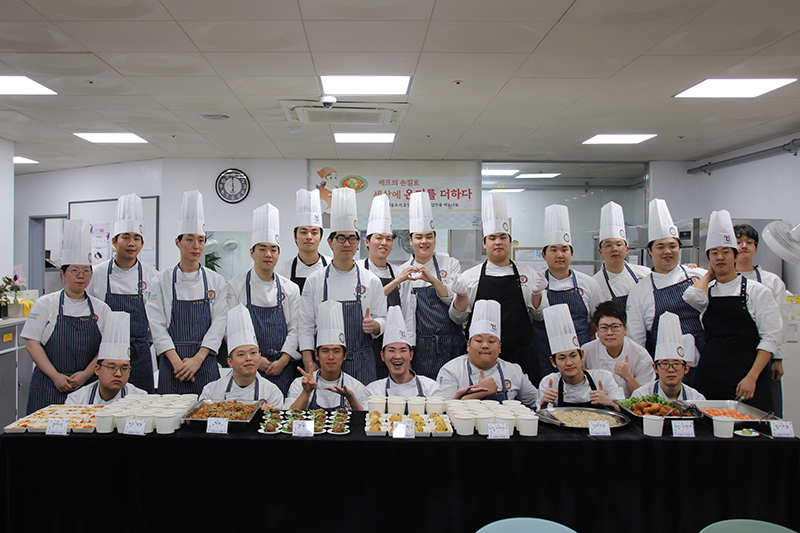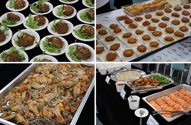 이날 행사에는 재학생들과 호텔조리계열 교수님들이 모두 참여하여 더욱 풍성한 활동을 펼쳤습니다. 학생들은 자신들의 뛰어난 조리 기술을 유감없이 발휘하며 떡갈비, 새우버거, 찜닭, 감자고로케, 차슈덮밥, 두부볼튀김, 김치 아란치니, 새우만두, 연어초밥, 라자냐, 소떡소떡 등 다채로운 메인 요리를 정성껏 준비하였습니다.