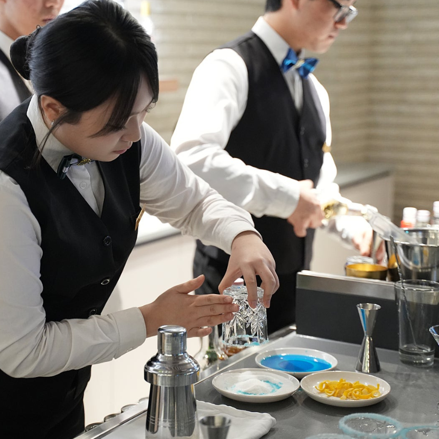 학생들은 바텐더로서의 숙련된 서비스는 물론 자리 안내, 세 가지 칵테일 메뉴에 대한 상세한 설명, 그리고 현란한 칵테일 제조 퍼포먼스까지 선보이며 실무 능력을 업그레이드 했습니다. 칵테일 제조는 물론 고객 응대와 전문적인 퍼포먼스 등 학생들의 어엿한 프로의 실력에 방문객들은 극찬을 아끼지 않았습니다.