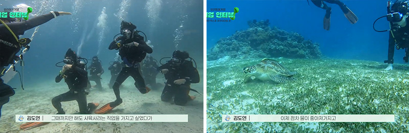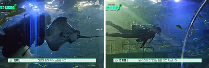 아쿠아리스트 업무는 한편으로 체력적으로도 쉽지 않고, 근무 시간 외에도 동물 상태를 점검하는 등 꾸준한 관리가 필요해 '직업병'처럼 시간을 체크하게 되는 고된 부분도 있다고 합니다. 하지만 다친 동물을 정성껏 치료해서 완치시킨 후 다시 건강한 모습으로 본 수조로 돌아가는 순간의 기쁨과 보람은 무엇과도 비교할 수 없다고 전했습니다.