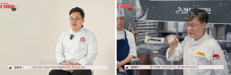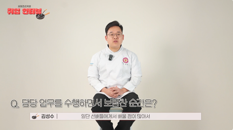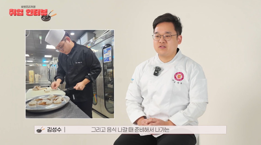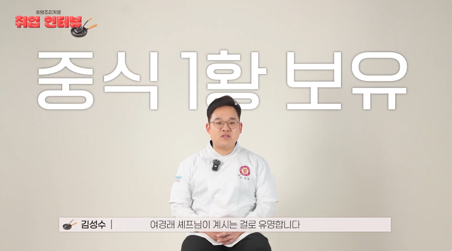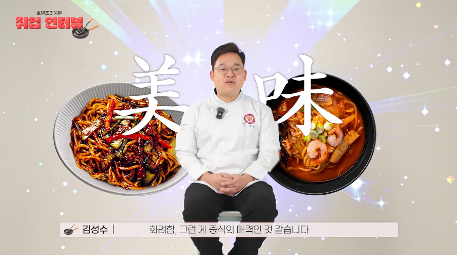 앞으로의 목표는 단순히 취업에 만족하는 것을 넘어, '중식' 하면 자연스럽게 이름이 떠오르는 존경받는 셰프로 성장하는 것이라고 밝혔는데요, 멋진 중식의 대가로 성장하기를 항상 응원하겠습니다! 호텔조리계열 김성수 선배의 이야기는 아래 영상에서 더 자세히 보실 수 있습니다.