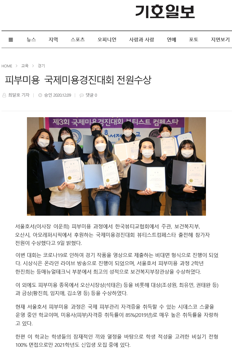 서울호서(이사장 이운희) 피부미용 과정에서 한국뷰티교협회에서 주관, 보건복지부, 오산시, 아모레퍼시픽에서 후원하는 국제미용경진대회 뷰티스트컴페스타 출전해 참가자 전원이 수상했다고 9일 밝혔다.
