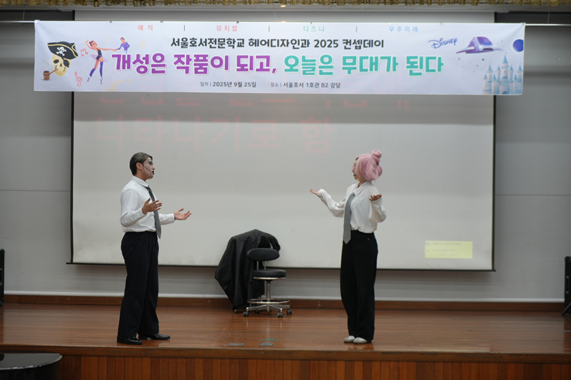 서울호서 대강당에서 뷰티아트계열 학생들의 실력과 재치를 뽐내는 2025 뷰티컨셉데이가 진행되었습니다. 뷰티컨셉데이는 1, 2학년 재학생들이 한 팀을 구성하여 컨셉 구상, 헤어, 메이크업, 의상, 안무, 음악 등을 함께 준비하여 발표하는 행사입니다.