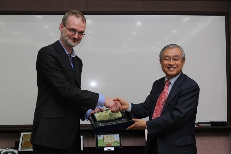 본교 이운희학장님께서 게임전문가 이안사이먼 교수님께 교수위촉패를 전달해주시며