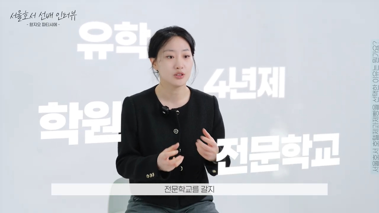 황지오 선배는 진학을 준비하던 당시 유학, 4년제 대학, 아카데미 등 여러 선택지 사이에서 많은 고민을 했다고 합니다. 하지만 본인을 충분히 성장시켜 줄 수 있는 훌륭한 전임 교수진이 있다는 점 때문에 서울호서를 선택하게 되었다고 합니다. 또한 기초부터 심화 과정까지 꼼꼼하게 이어지는 실무 중심의 커리큘럼은 선배가 현장에서 전문성을 발휘할 수 있는 든든한 자양분이 되었고, 단 한 번도 그 선택을 후회한 적이 없다는 말도 함께 남겼습니다.