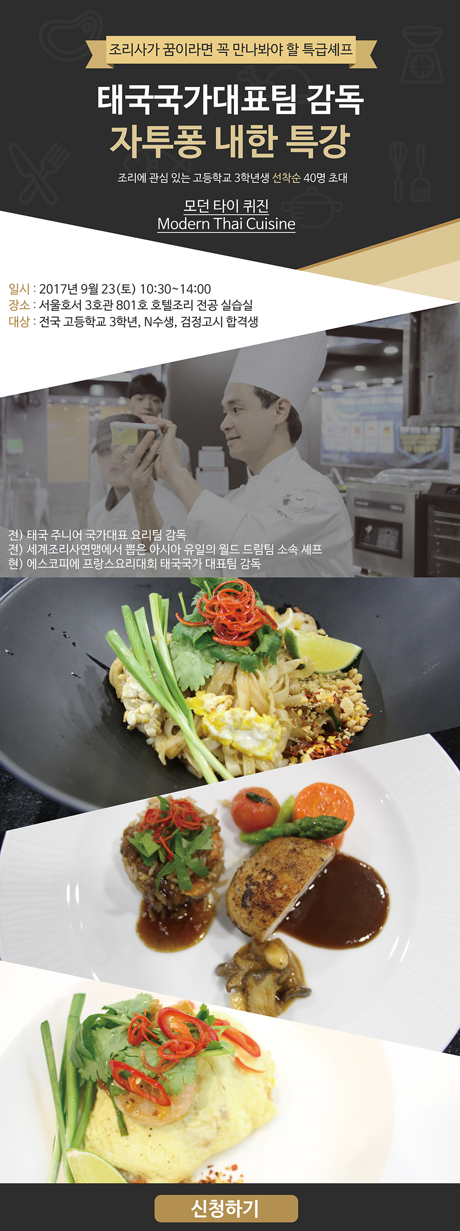 일시 : 2017년 9월 23일(토) 10:30 ~ 14:00 / 장소 : 서울호서 3호관 801호 호텔조리 과정 실습실 / 대상 : 전국 고3, N수생, 검정고시 합격생