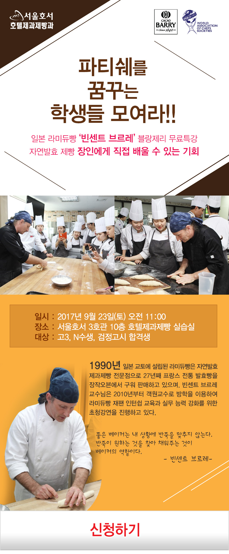 일시 : 2017년 9월 23일(토) 오전11:00 / 장소 : 서울호서 3호관 10층 호텔제과제빵 실습실 / 대상 : 고3, N수생, 검정고시 합격생