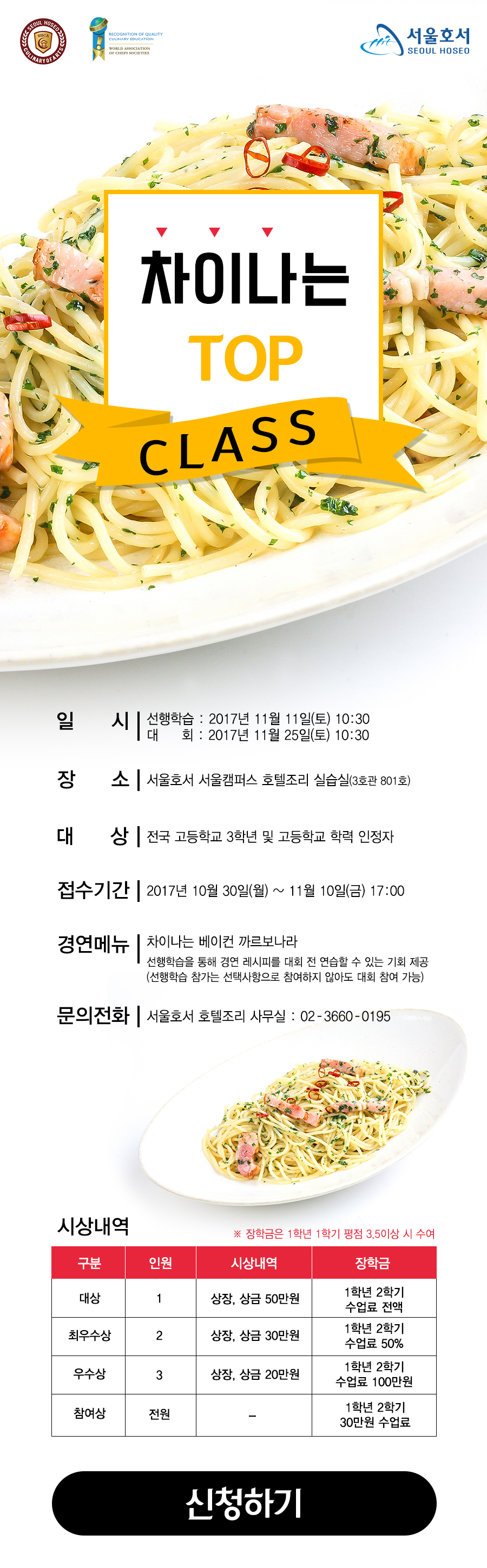 접수기간 : 2017년 10월 30일(월)~11월 10일(금) 17:00 / 장소 : 서울호서 서울캠퍼스 호텔조리 실습실(3호관 801호) / 대상 : 전국 고등학교 3학년 및 고등학교 학력 인정자