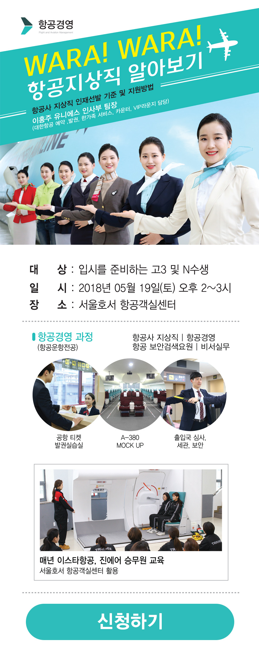일시 : 2018년 04월 13일(토) 오후 2~3시 / 대상 : 입시를 준비하는 고3 및 N수생 / 장소 : 서울호서 1호관 항공객실센터