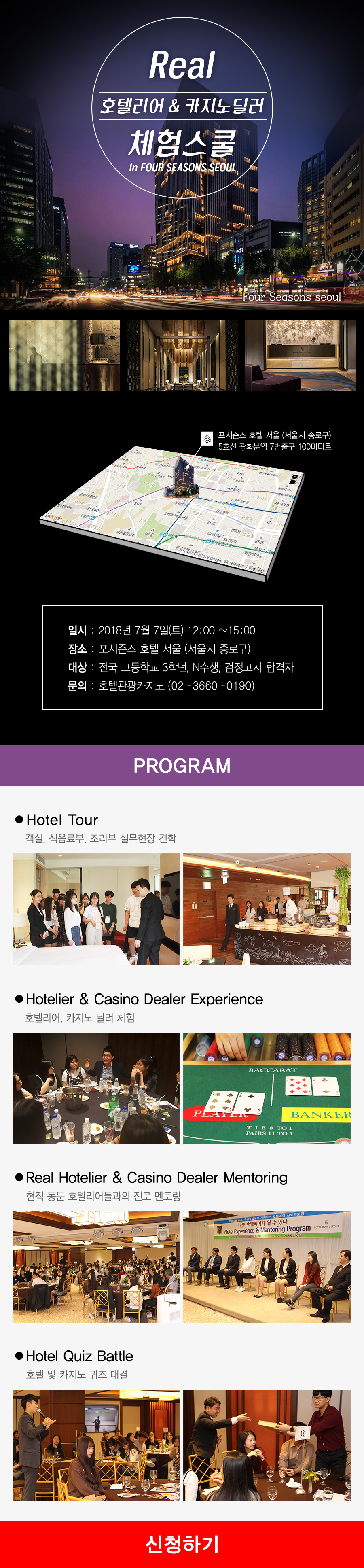 일시 : 2018년 7월 7일(토) 12:00 ~15:00 / 장소 : 포시즌스 호텔 서울 (서울시 종로구) / 대상 : 전국 고등학교 3학년, N수생, 검정고시 합격자 / 문의 : 호텔관광카지노 02-3660-0190