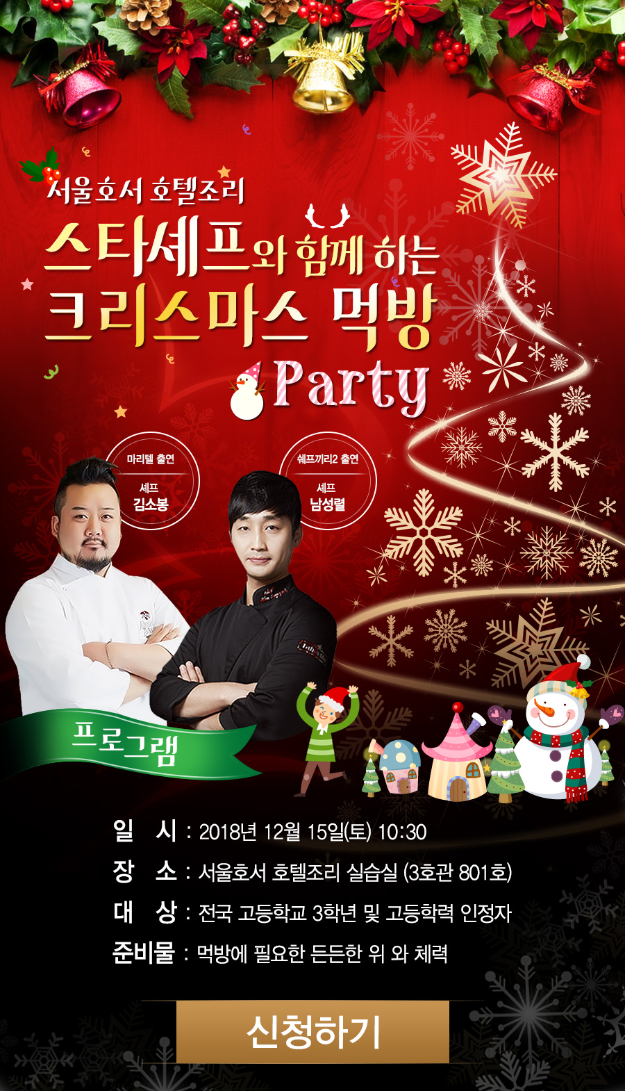 일시 : 2018년 12월 15일(토) 10:30 / 장소 : 서울호서 호텔조리 실습실(3호관 801호) / 대상 : 전국 고등학교 3학년 및 고등학력 인정자
